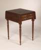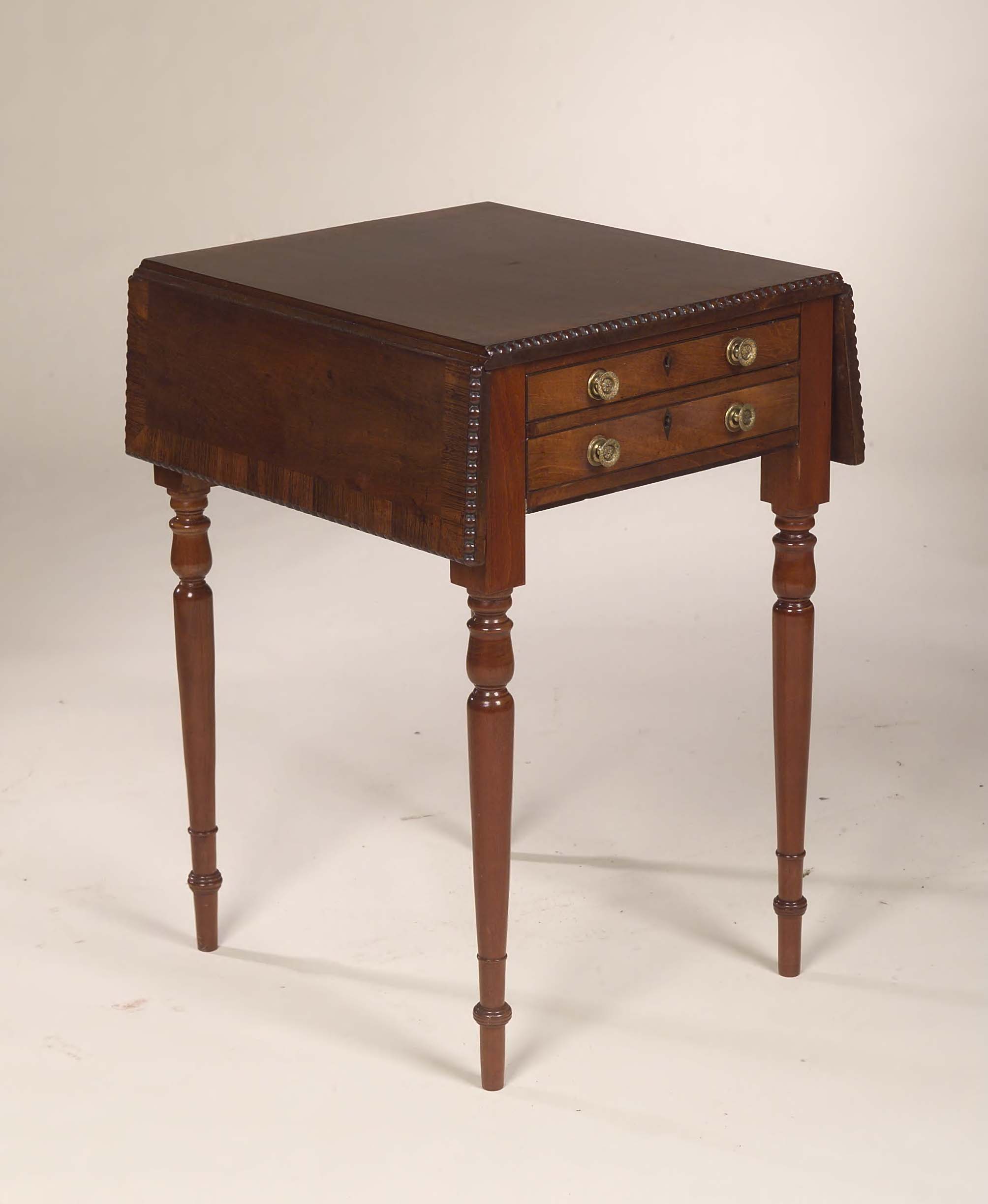 the rosewood crossbanded rectangular top with beaded edge and drop flaps above pair of drawers and ring turned tapering legs