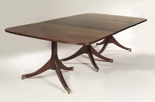 the top with rounded ends and reeded edge above tapering pedestals with tripod bases having reeded sabre legs terminating in brass caps and castors, includes two extra leaves and fillets converting two pedestals to breakfast tables