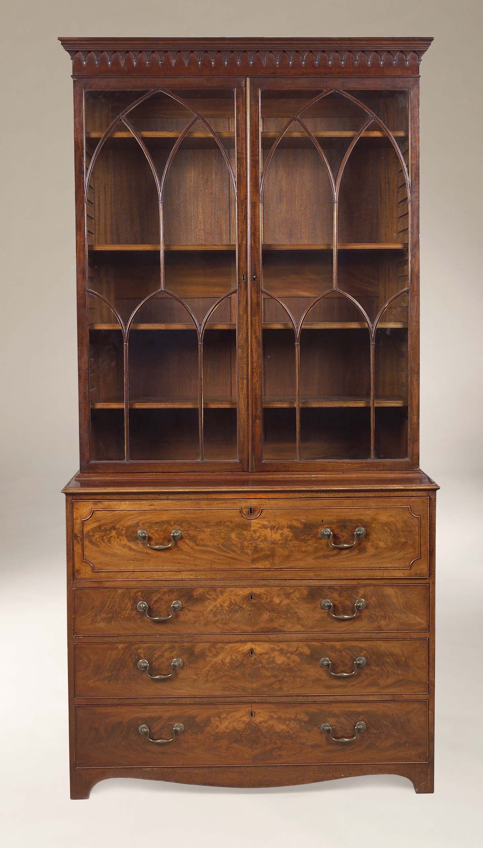 the moulded cornice with pendant frieze above pair of Y-tracery astragal glazed doors enclosing adjustable shelves raised on deeper base with fitted drawer above three graduated drawers on cut bracket feet