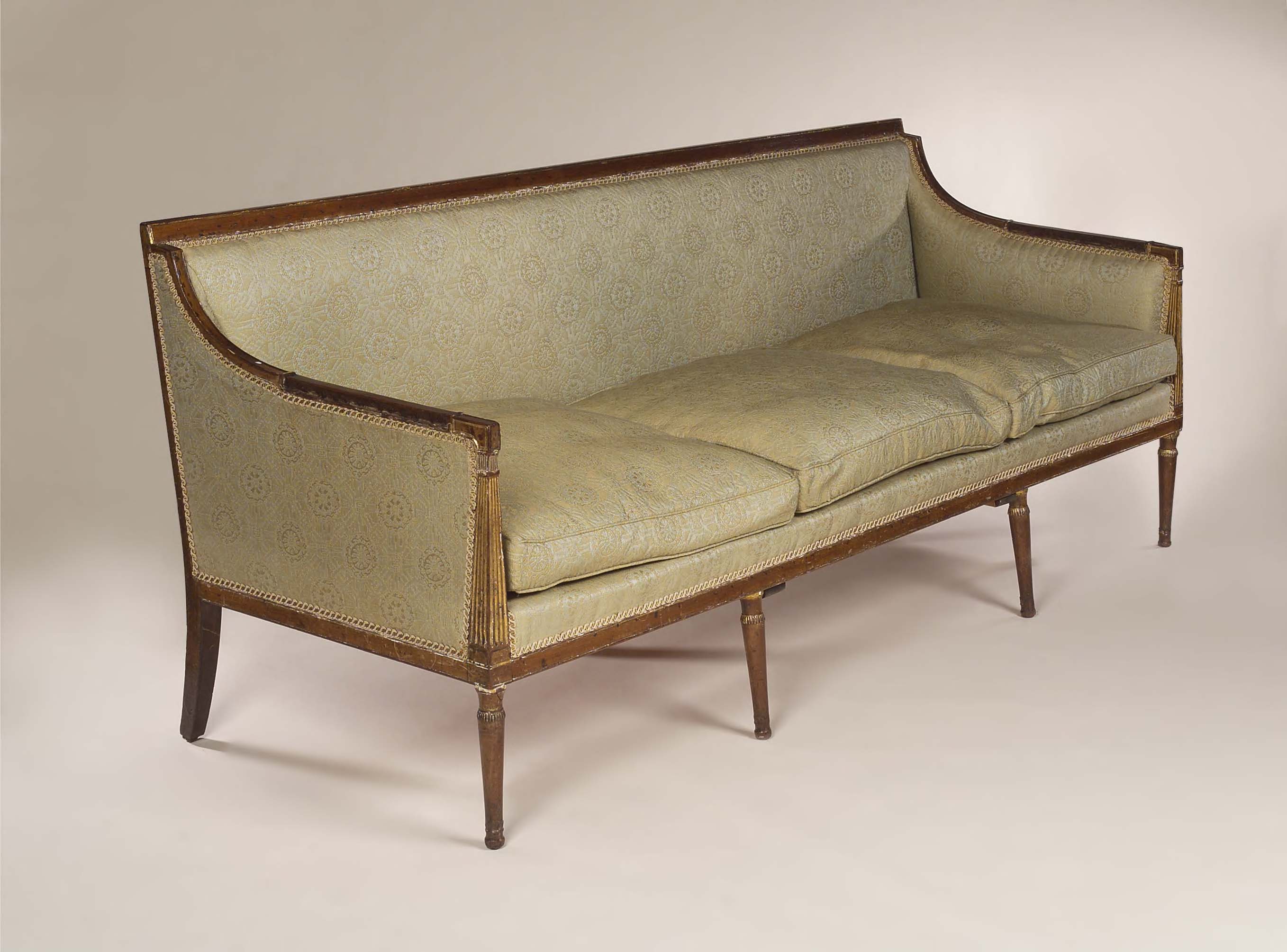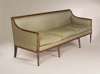 partially gilt, the square framed upholstered back and arms enclosing stuffover seat and squab, the arms with tapering fluted terminals, on turned and lobed front legs