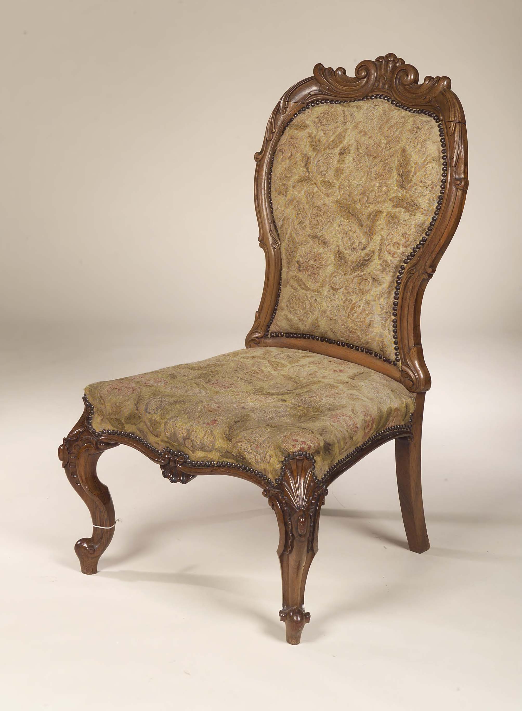 in the manner of Gillows, the waisted back with C and S scroll carving enclosing raised pad, above serpentine stuffover seat and shell cabochon carved cabriole legs with scroll toes
