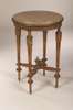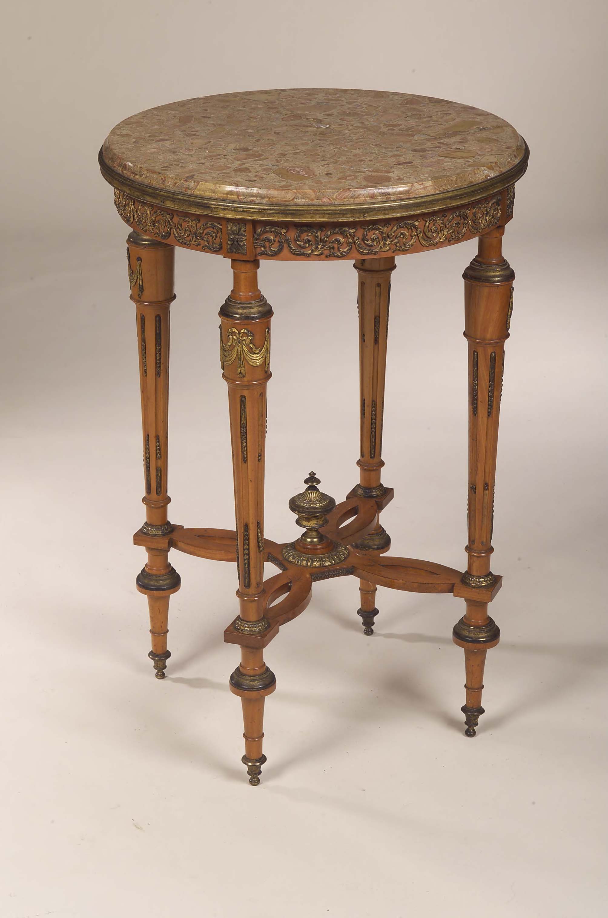 with gilt brass mounts, the circular marble top above scrolling frieze on four turned and fluted legs joined by interlaced X-stretcher bearing urn finial and raised on toupie feet