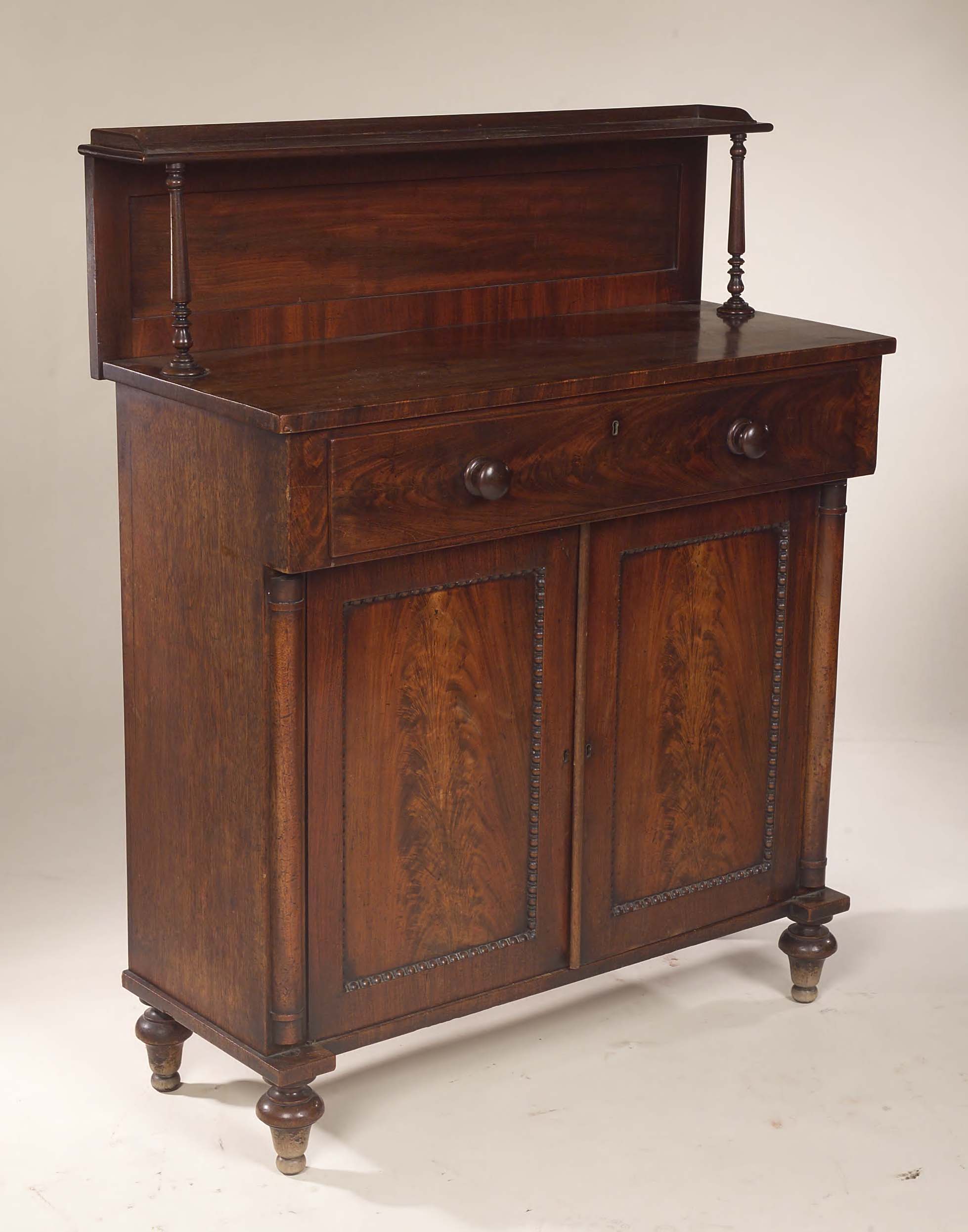 the open stage back above frieze drawer and pair of bead and reel panelled doors flanked by half columns, turned feet
