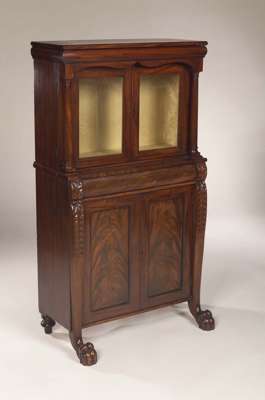 the rectangular top with cushion frieze drawer above pair of glazed doors flanked by columns, the deeper base with corresponding frieze drawer and pair of panelled doors flanked by leaf carved pilasters, carved paw front feet