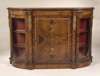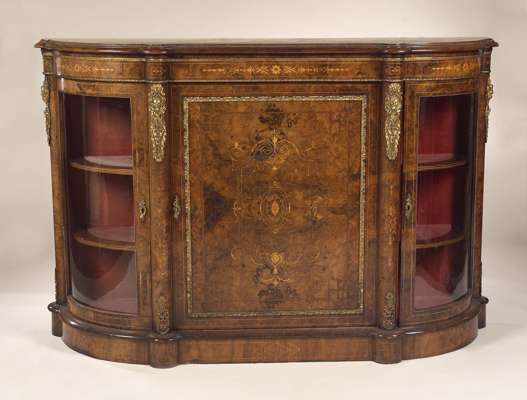 with boxwood stringing and marquetry decoration, gilt brass mounts, the shaped top with quadrant ends above inlaid frieze and central panelled door flanked by half columns with mask mounts and glazed outer doors, plinth base
