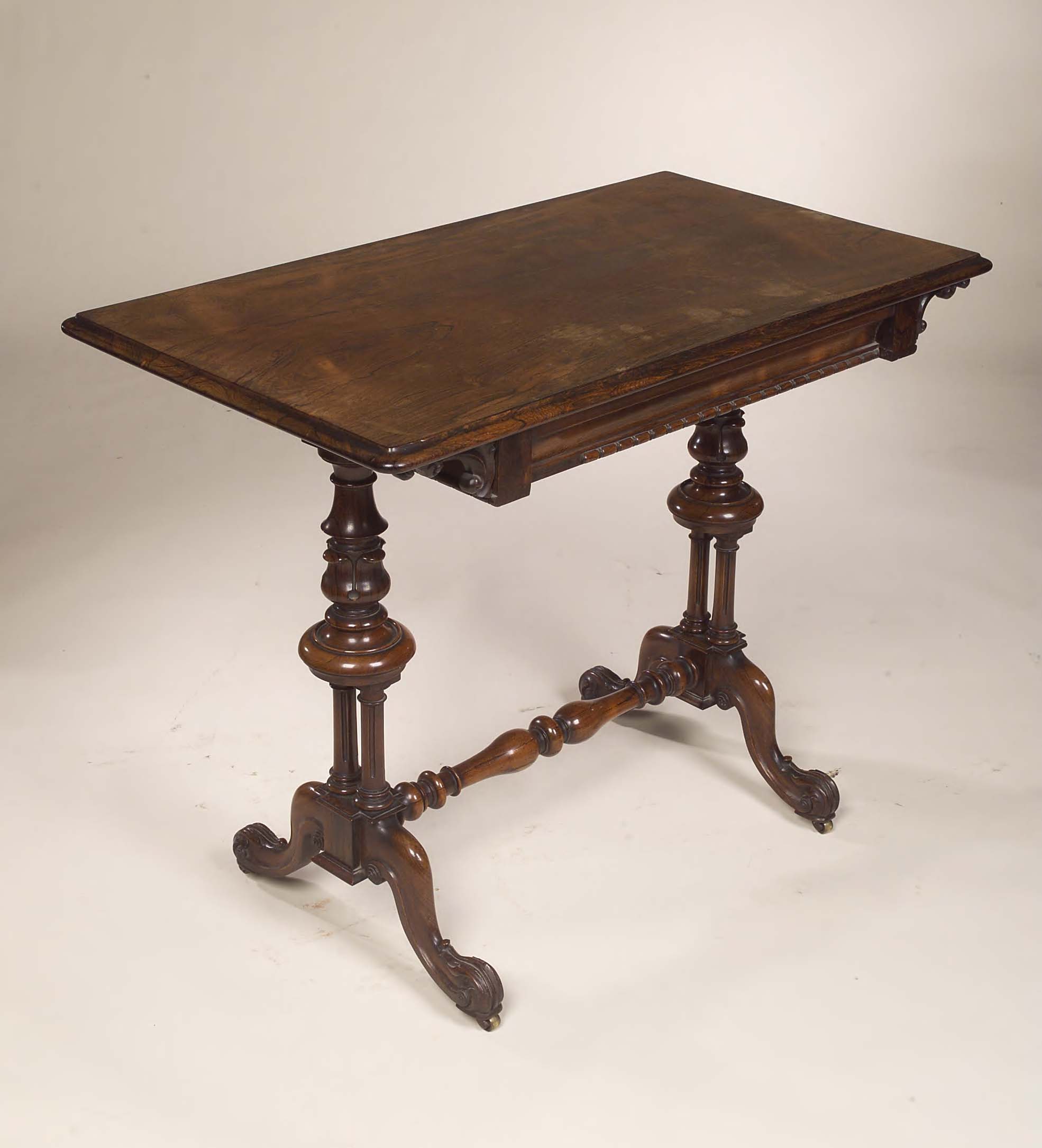the rectangular top with moulded edge above concave frieze with bead and reel moulding, raised on turned carved supports joined by ring turned stretcher, cabriole legs with leaf carved scroll toes and castors