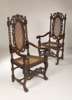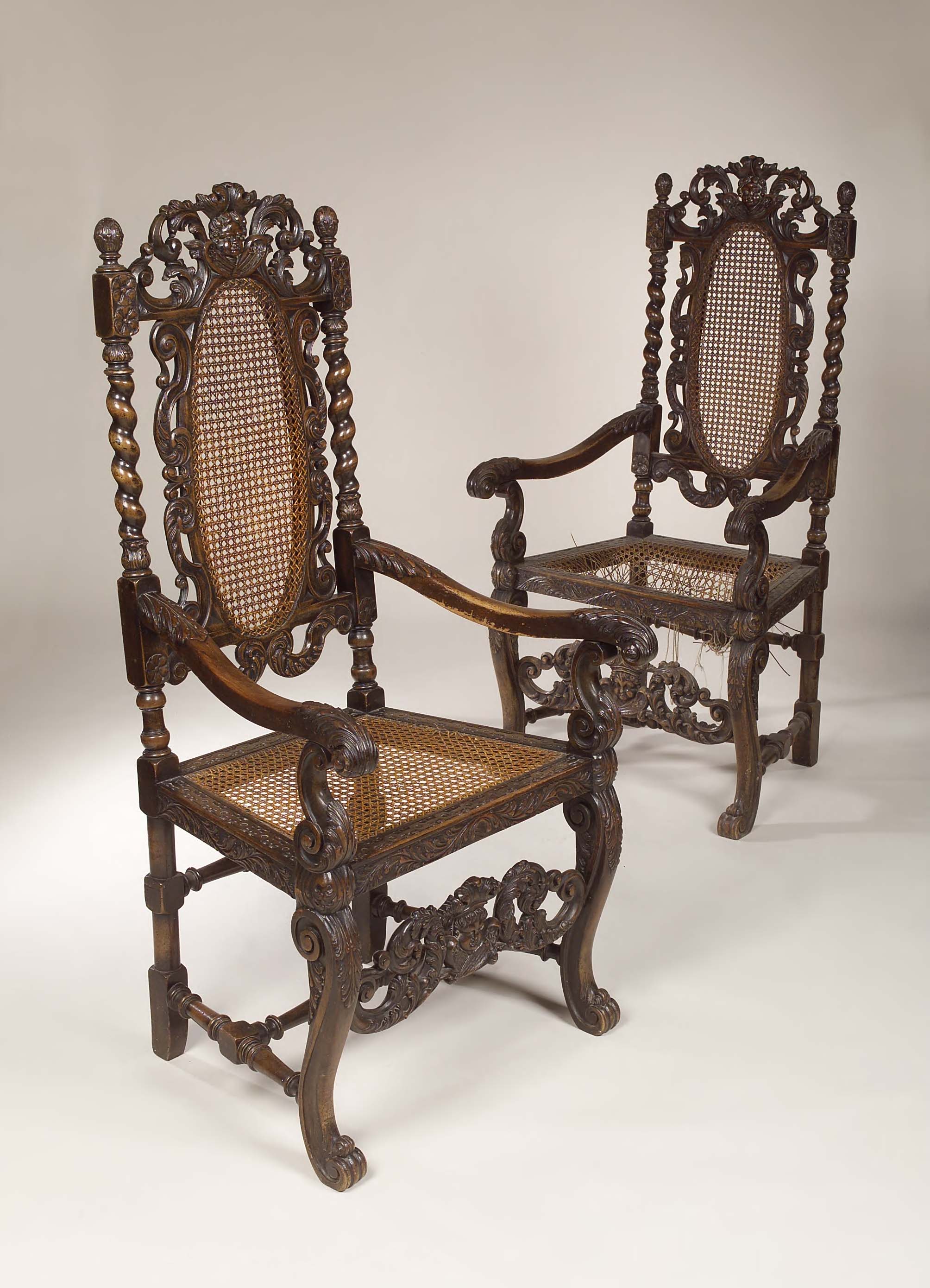 each with oval caned back in leaf carved scrolling frame flanked by barleytwist columns, corresponding arms and console front legs joined by turned and blocked H-stretcher, caned seat with relief carved rails (2)