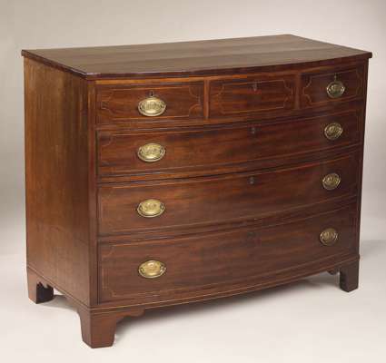 with box wood stringing, three short drawers over three long graduated drawers, shaped bracket feet