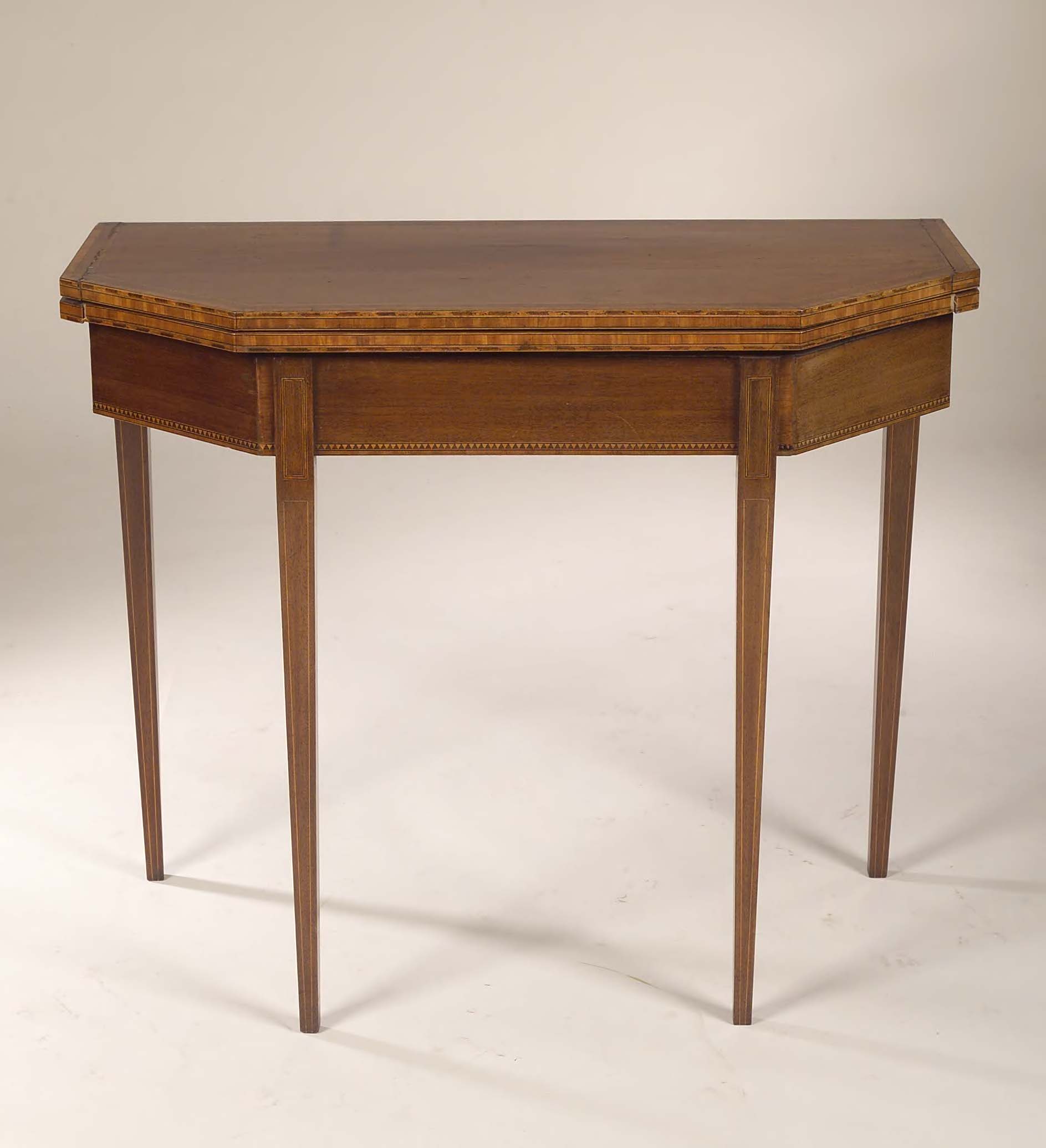 with satinwood crossbanding and chequer stringing, the octagonal top above square section tapering legs