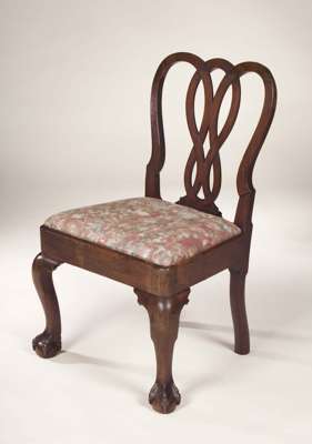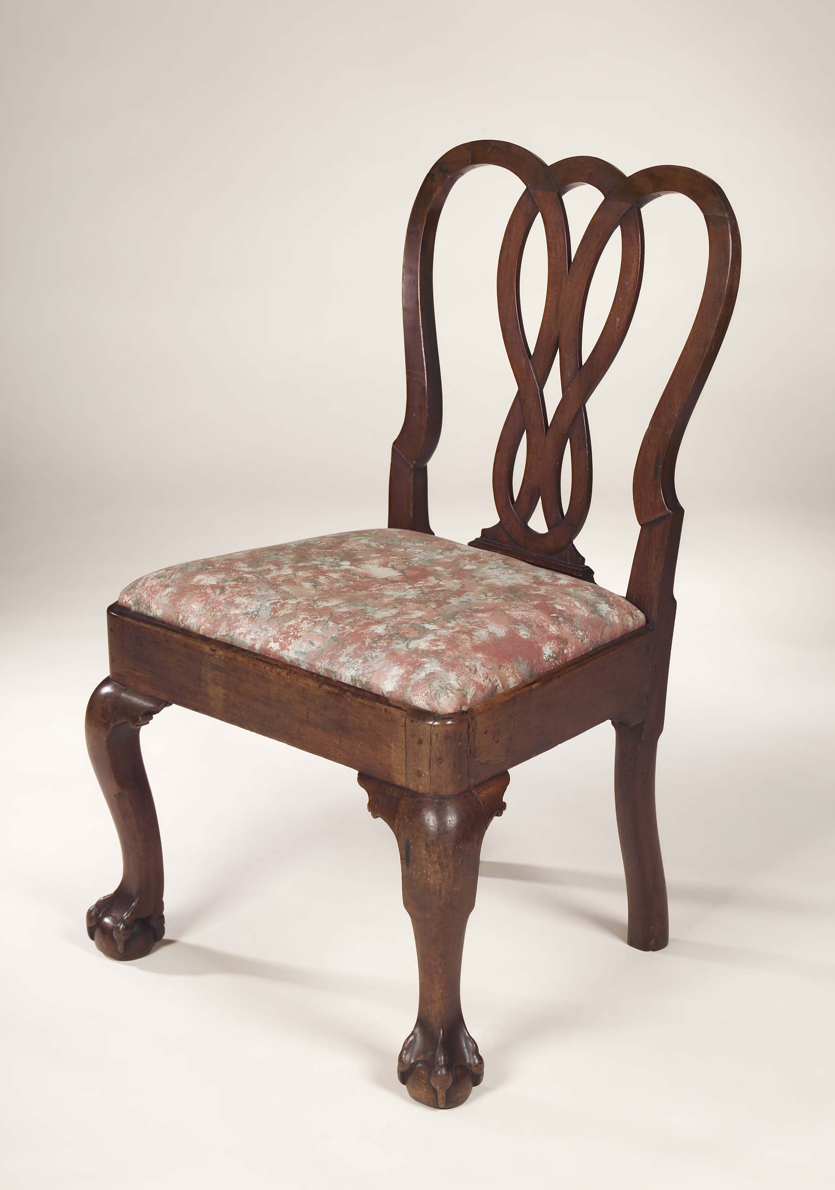 in the manner or Robert Manwaring, the pierced interlaced back above drop-in seat and cabriole front legs with ball and claw feet, the rear legs downcurved at the base