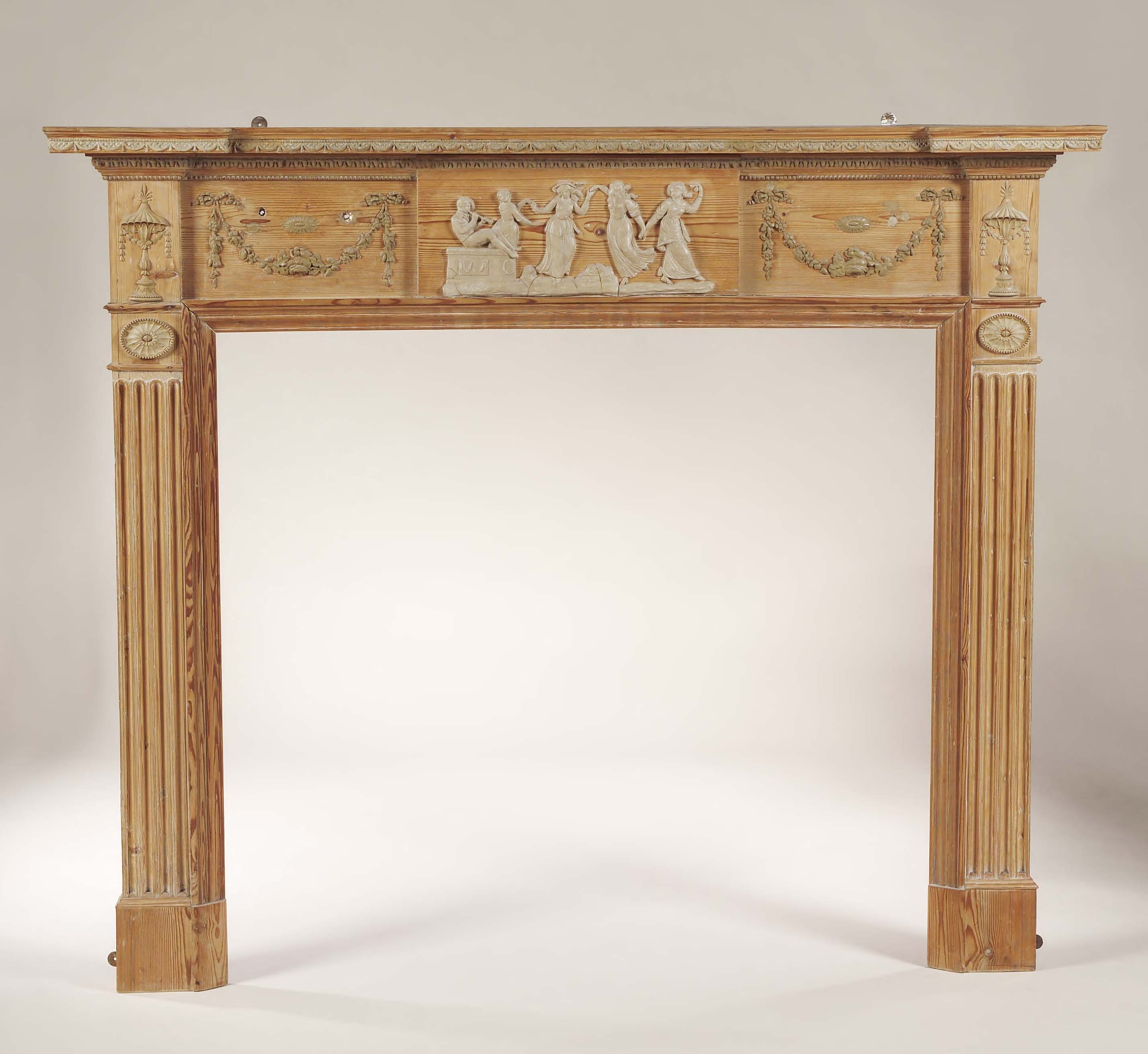 the reverse breakfront cornice above a central tablet of maidens dancing flanked by ribbon tied festoons and fluted pilasters with fan patera terminals