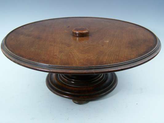 the revolving circular tray with moulded thumbnail edge and central boss, raised on turned pedestal and saucer base with disc feet