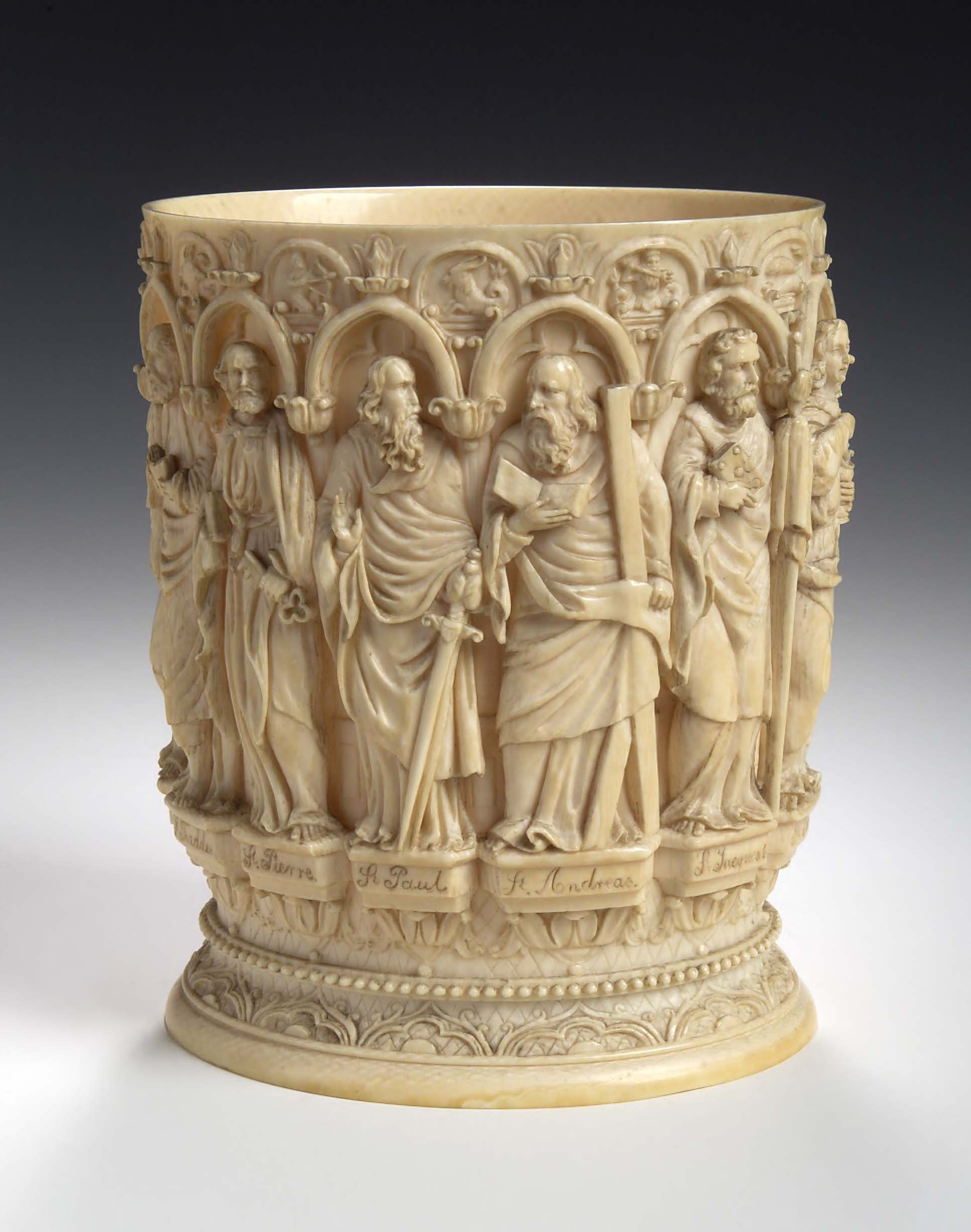 carved with the twelve apostles, standing in classical attire in Gothic arcade, each bearing a distinctive object and resting on a bracket inscribed with his name, with a foliate carved plinth, the underside inscribed with a coat of arms; with an associated timber base (2)
