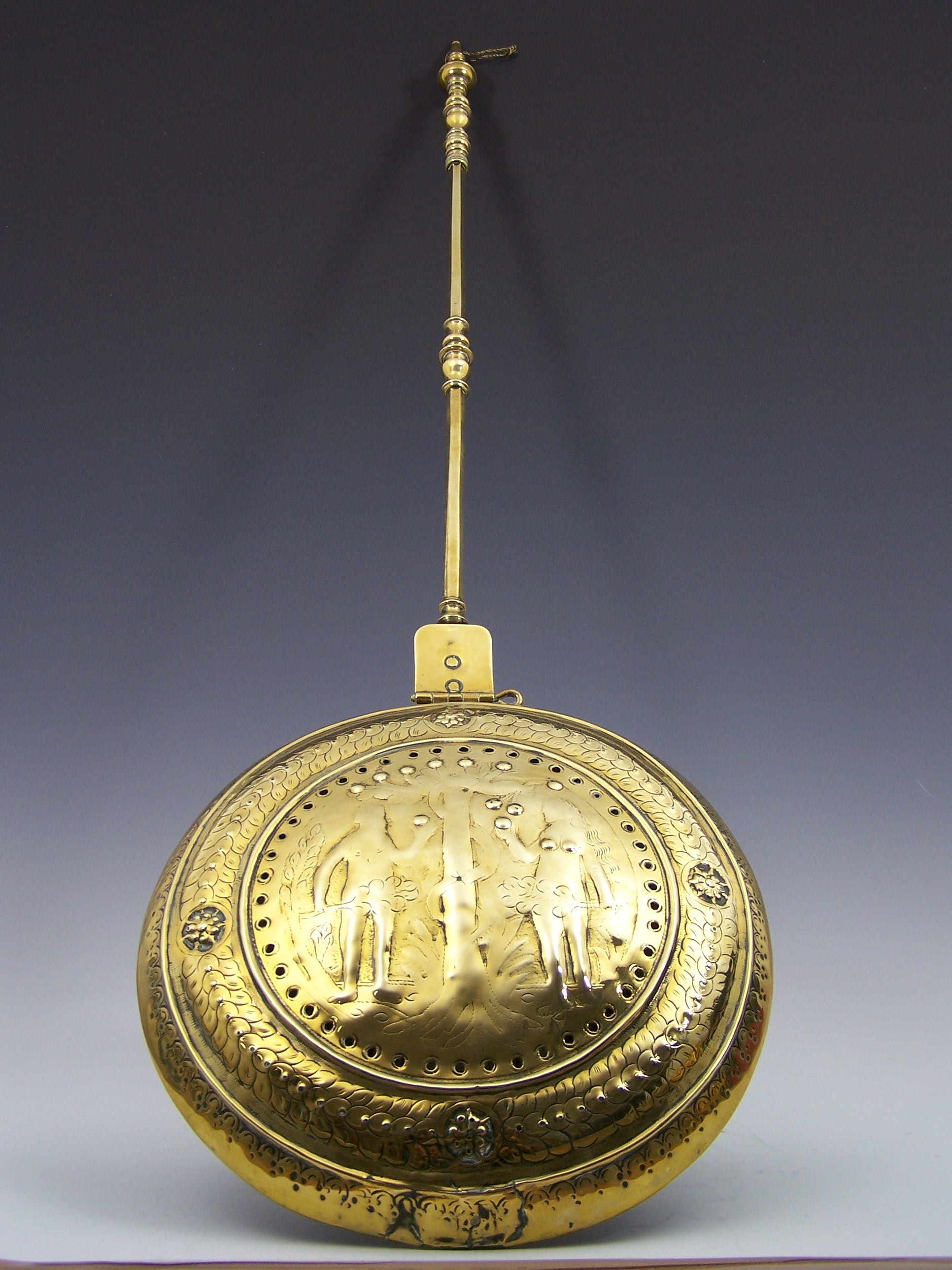 the turned and knopped hexagonal handle with repousse decorated and pierced hinged lid with Adam and Eve to the centre