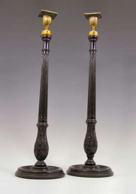 each with brass urn nozzle, turned and fluted column with leaf carved base and spreading saucer foot