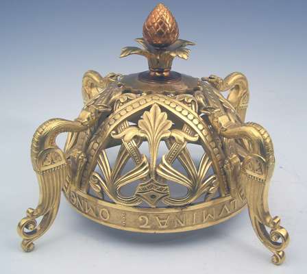 the pierced circular basket with strap work and scrolling foliate decoration, four applied dragon handles and acorn pendant, the rim inscribed "erat lux vera quae illuminate omnem nominem"