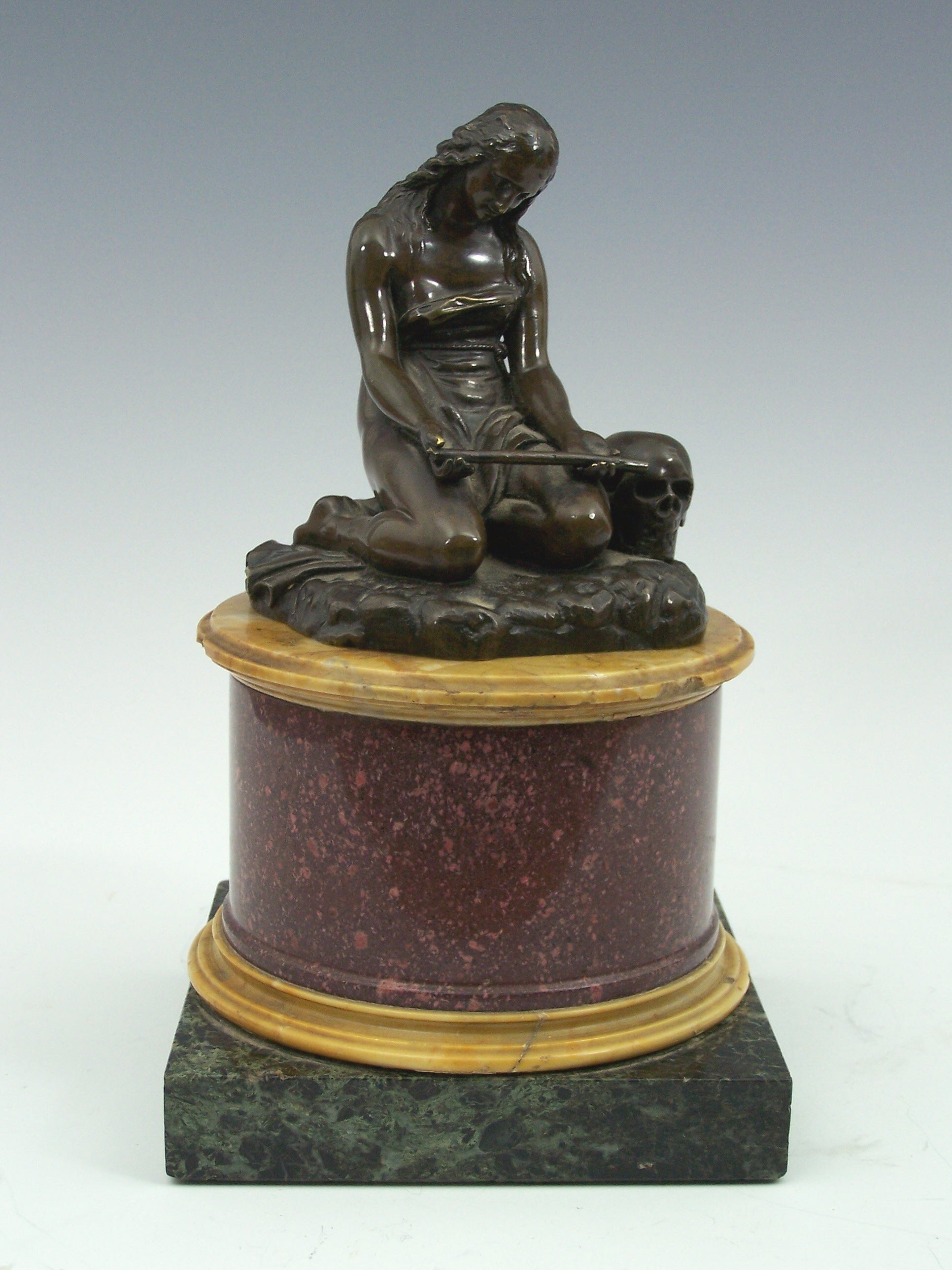 with a skull, 13.5cm high; together with a turned porphyry and marble pedestal, 15cm wide, 13cm high (2)