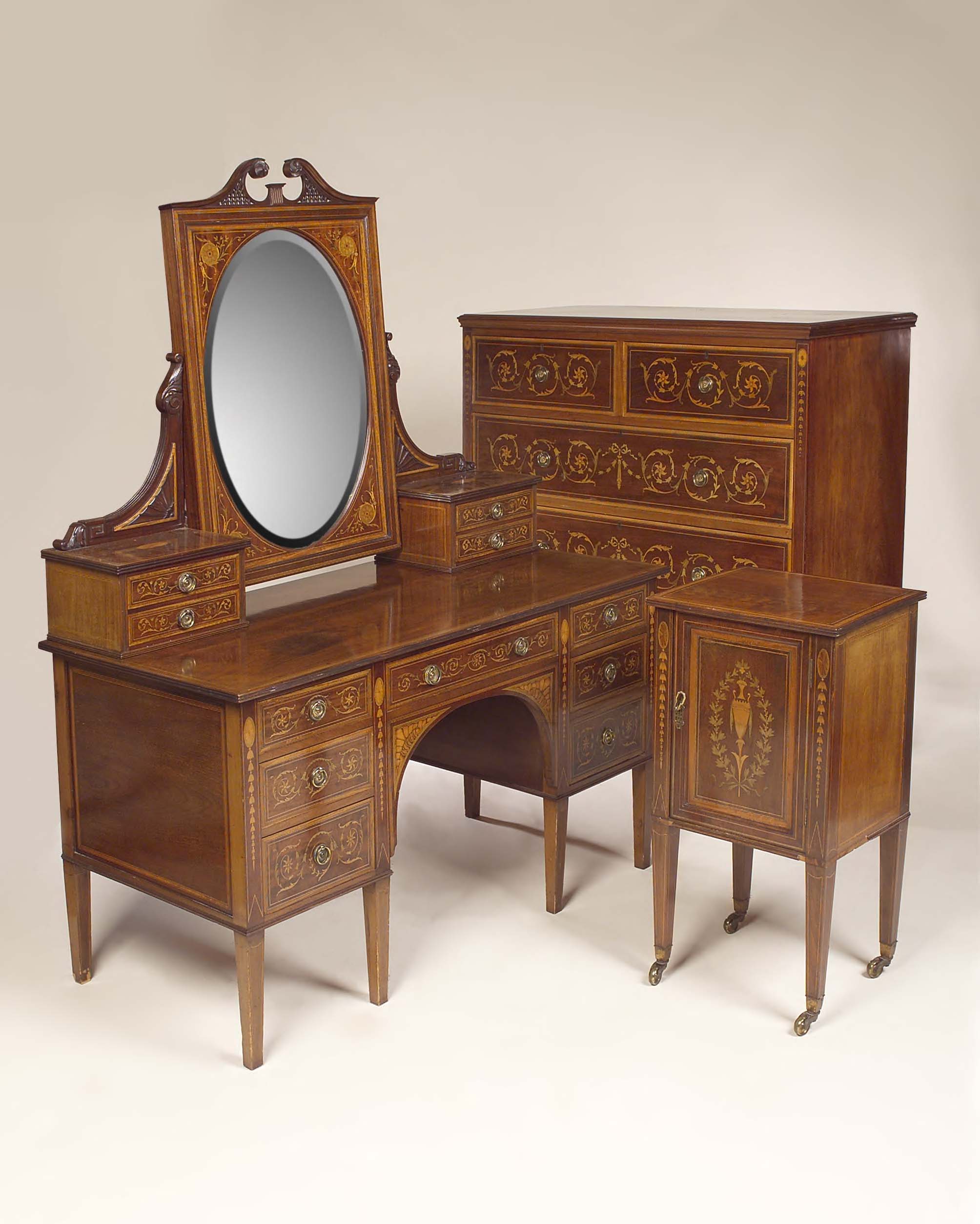 profusely inlaid with neo-Classical decoration and satinwood crossbanding, comprising a three door wardrobe, the pierced broken pediment above a moulded and dentilled cornice fitted with an oval mirrored door flanked by panelled cupboard doors inlaid with urns, trailing flower sprays and acanthus foliage, on a moulded plinth base with bracket feet, 208cm wide, 240cm high, 63cm deep; a dressing table, the oval bevelled plate in a moulded frame with swan neck pediment supported by splayed acanthus carved columns, each fitted with two short drawers, on square tapering supports, castors lacking, 123cm wide, 162cm high, 61cm deep; a night cupboard, the moulded rectangular top above a panelled cupboard door on square tapering supports, 41cm wide, 78cm high, 35cm deep; and a chest of drawers, with moulded rectangular top abvoe two short and three long graduated drawers, on a plinth base, 122cm wide, 122cm high, 52cm deep (4)