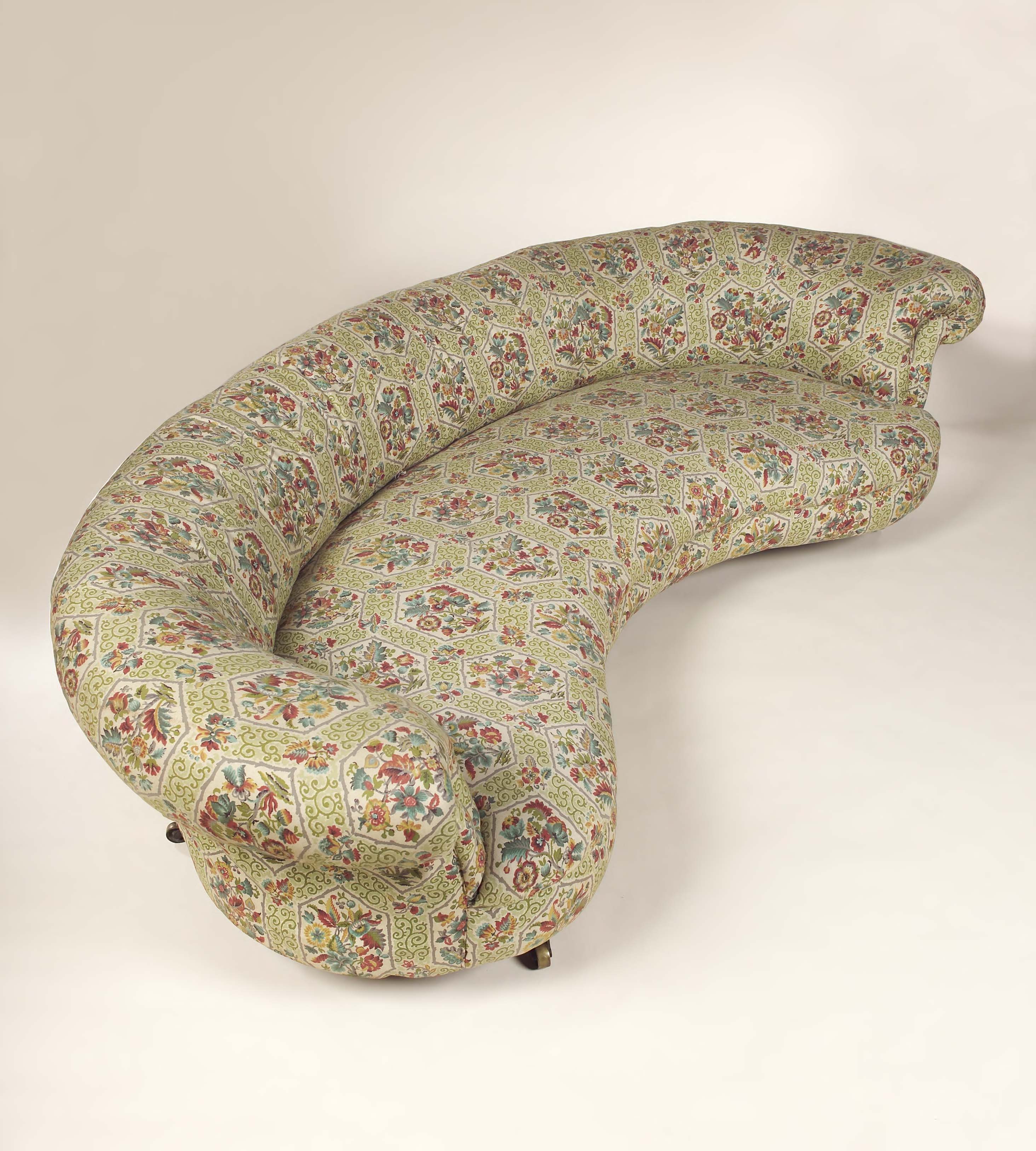the curved padded back above a kidney-shaped upholstered seat on turned mahogany front feet and stamped castors