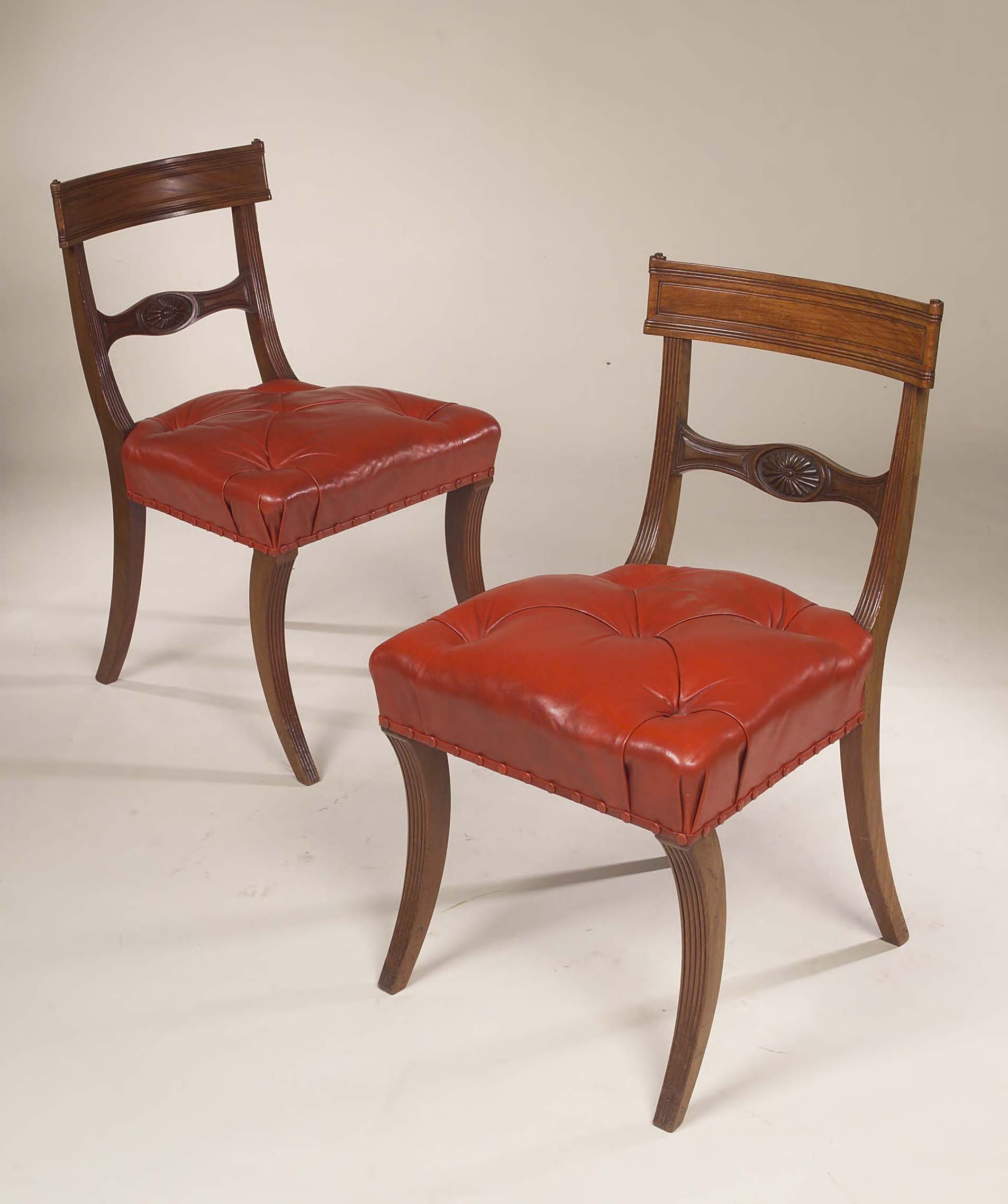 each with moulded tablet top rails above waved horizontal splats centred by stylised flower heads, the red hide button upholstered seats on moulded sabre supports, two of early 19th century date, inscribed RAMSAY in ink to the seat rail (9)