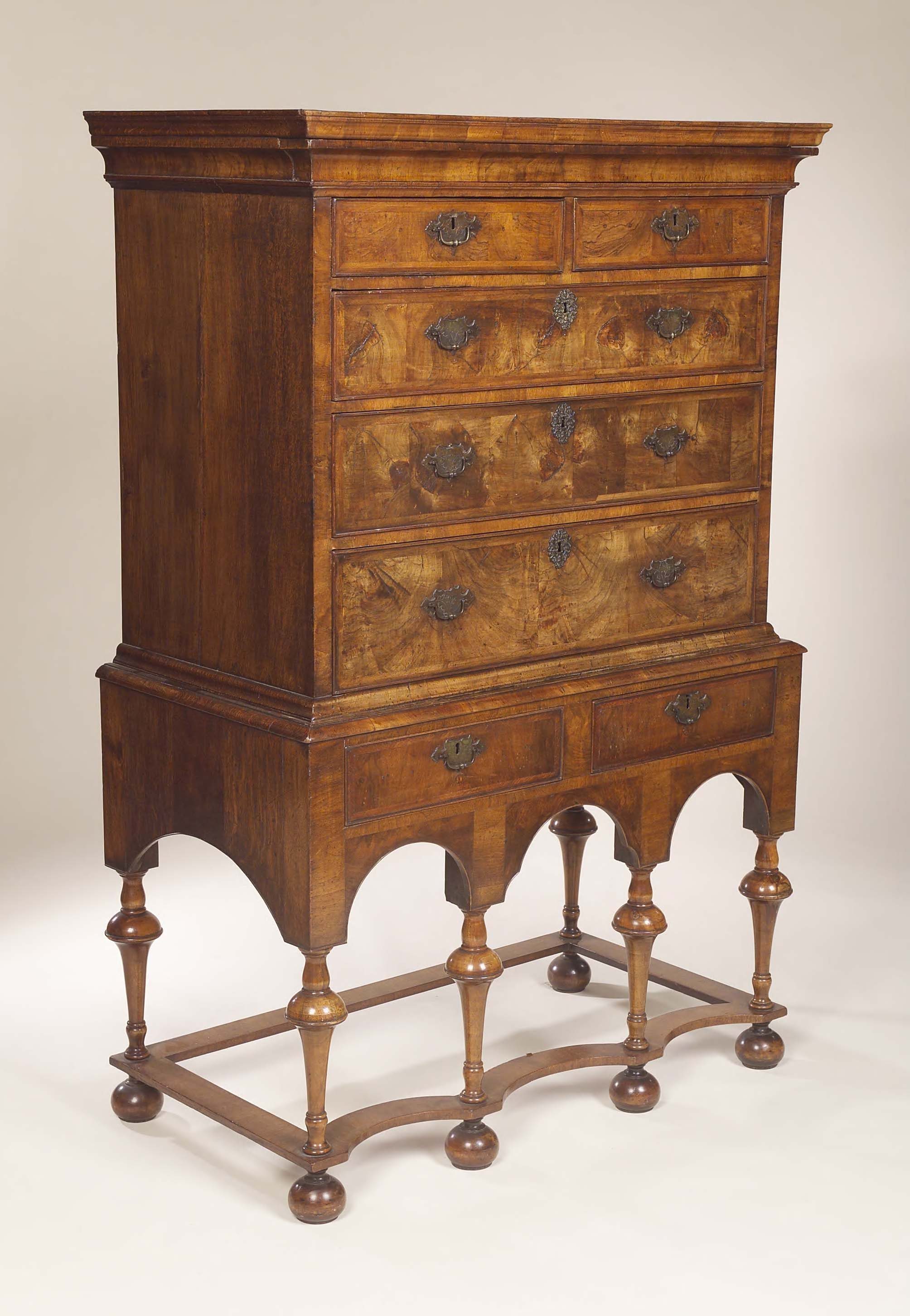 herringbone crossbanded, the moulded cornice above an ovolo drawer and two short and three long graduated drawers, the later base fitted with two drawers, above the arched apron on turned baluster supports and bun feet joined by waved platform stretchers