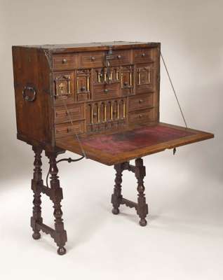the bargueno with steel strapping and hinges, decorative lock and applied gilt mask bosses, the fall front enclosing finely fitted interior with architectural cupboards and drawers, leather lined slope; the table with turned and blocked trestle supports joined by wrought iron stretcher (2)