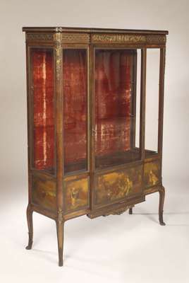 bearing label of S & H Jewell, London, with gilt mounts, finely cast floral cast guilloche frieze centred by bacchanalian mask and opposing rams above bevelled glazed door and flanks enclosing velvet lined interior with glass shelves, above Vernis Martin panels on shaped legs