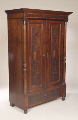 the moulded cornice with segmental arched cresting and finials, the strapwork frieze above pair of similarly panelled doors flanked by Ionic columns, drawer below, turned feet