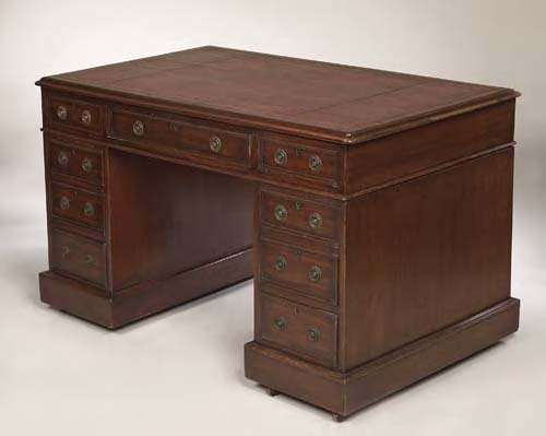 the rectangular moulded top with inset skiver, above arrangement of nine drawers around kneehole, plinth base with castors