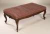 the rectangular stuffover squab above scrolling rails centred by cabochon and moulded cabriole legs with scroll toes and castors