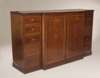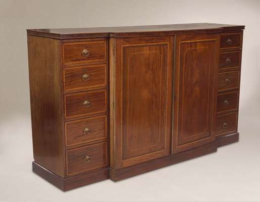 by T Willson, Great Queen Street, London, with satinwood crossbanding, with pair of cupboard doors at centre enclosing sliding trays flanked by banks of graduated drawers, plinth base