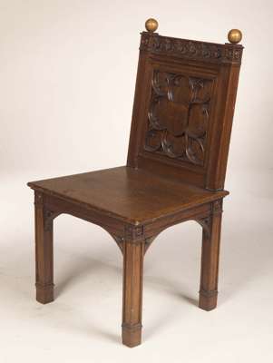 the square back leaf carved rail and bell terminals above cusped tracery panel centred by blind shield, spreading large board seat and panelled square section legs with pierced brackets