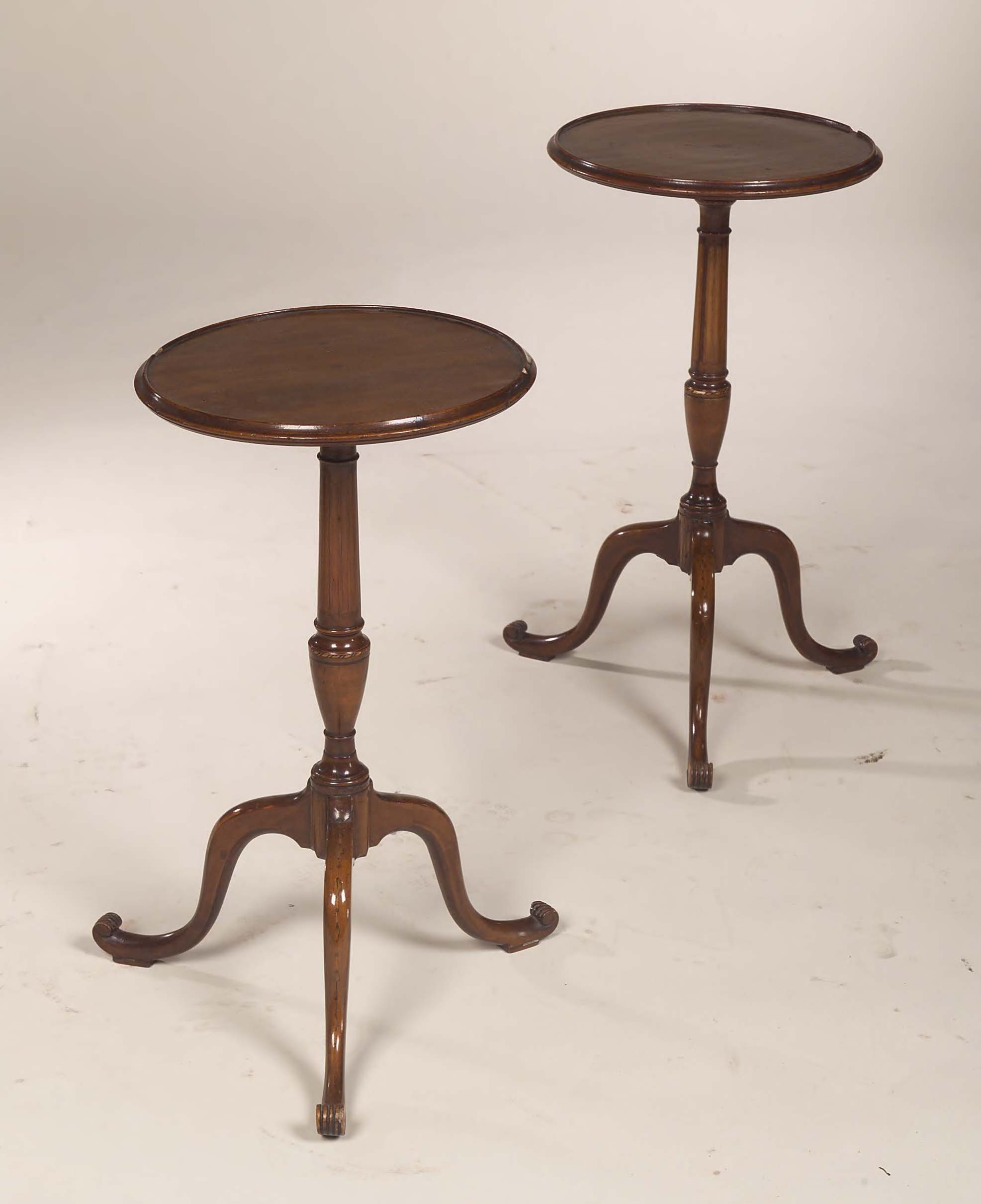 the circular saucer tops raised on turned pedestals with inlaid flutes, cabriole legs with scroll toes (2)