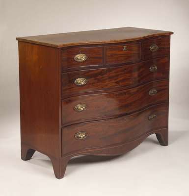 with boxwood stringing, the moulded shaped top above three short and three long drawers, oval brass back plates, and loop handles, shaped apron and splayed bracket feet