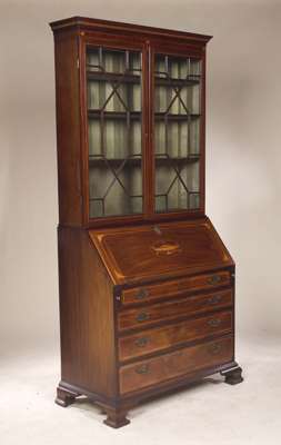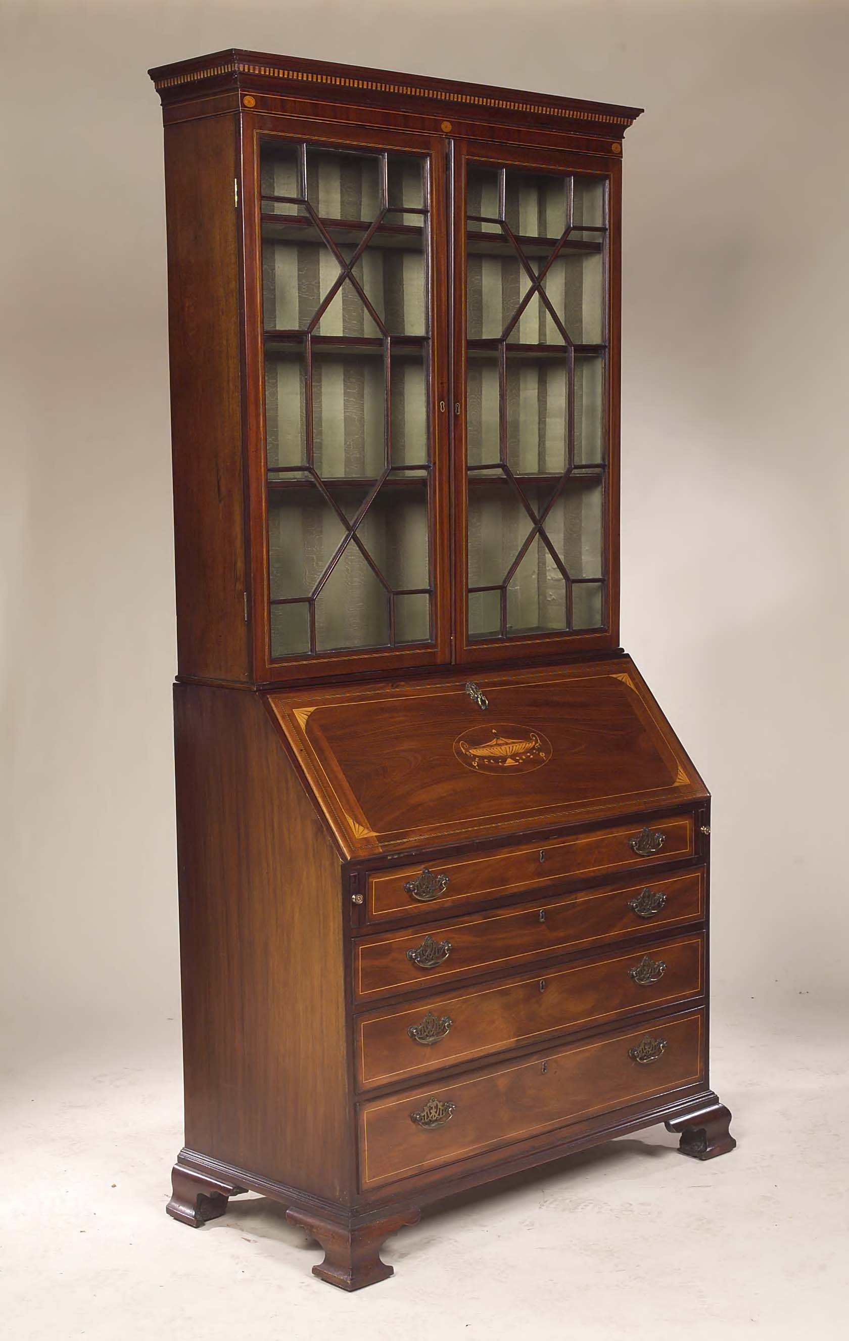 with boxwood stringing, the moulded inlaid cornice above two astragal glazed doors enclosing adjustable shelves, on a bureau with fall front centred by urn patera enclosing an inlaid fitted interior above four long graduated drawers, ogee bracket feet