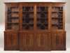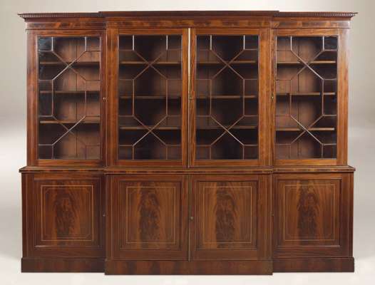 with boxwood, chequer and feather stringing, the dentilled cornice above astragal glazed doors enclosing adjustable shelves, the deeper base with panelled doors on plinth