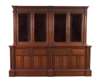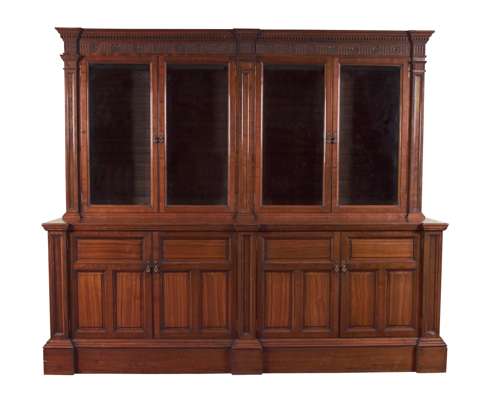 the bays divided by panelled plasters, above glazed doors enclosing adjustable shelves, on deeper base with panelled doors, plinth