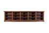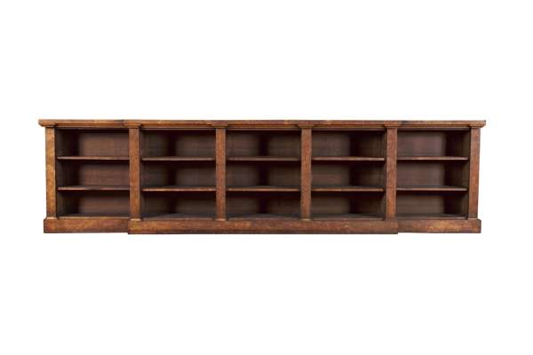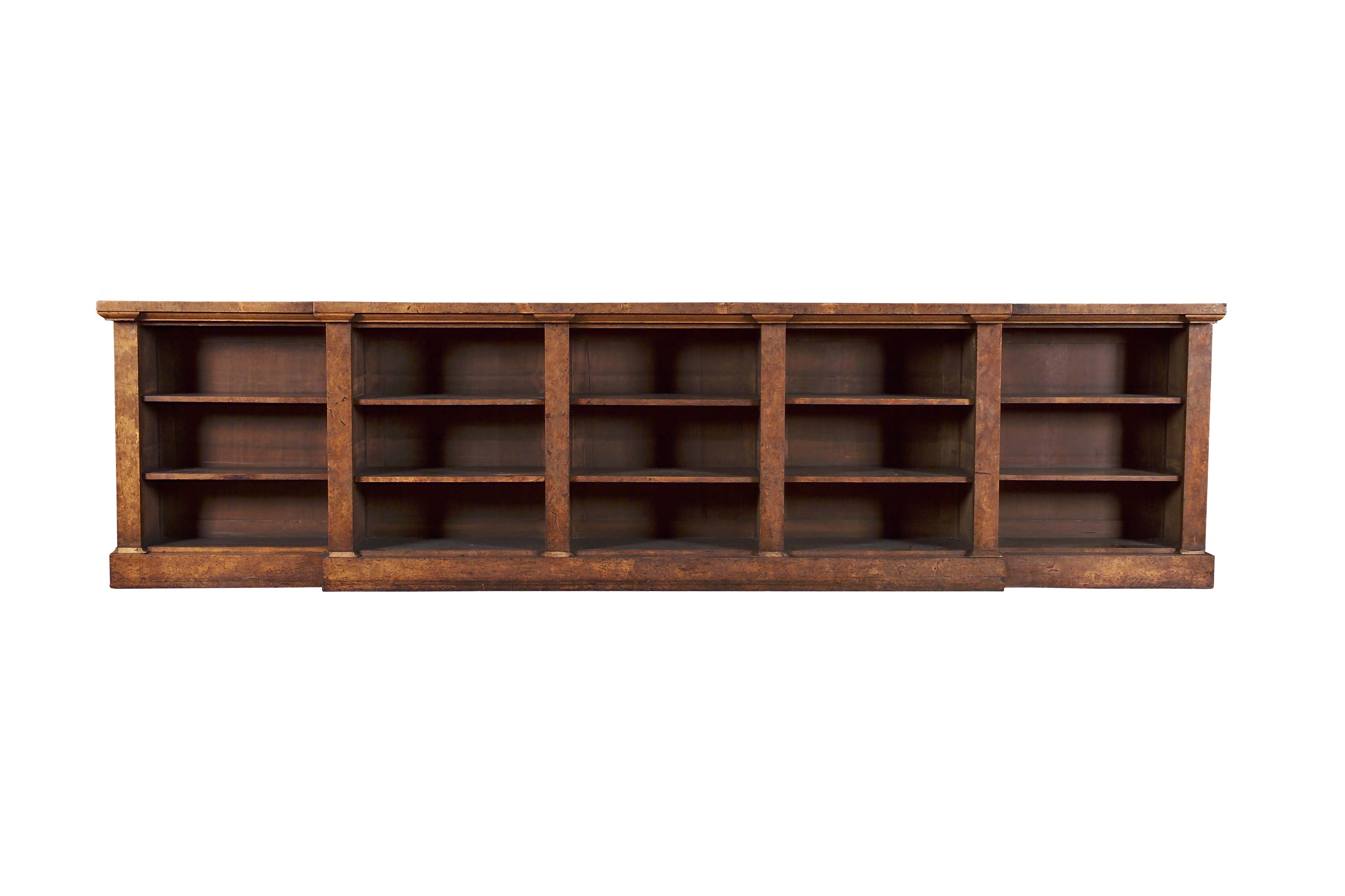 the projecting cornice above five bays of adjustable shelves divided by pilasters, plinth base