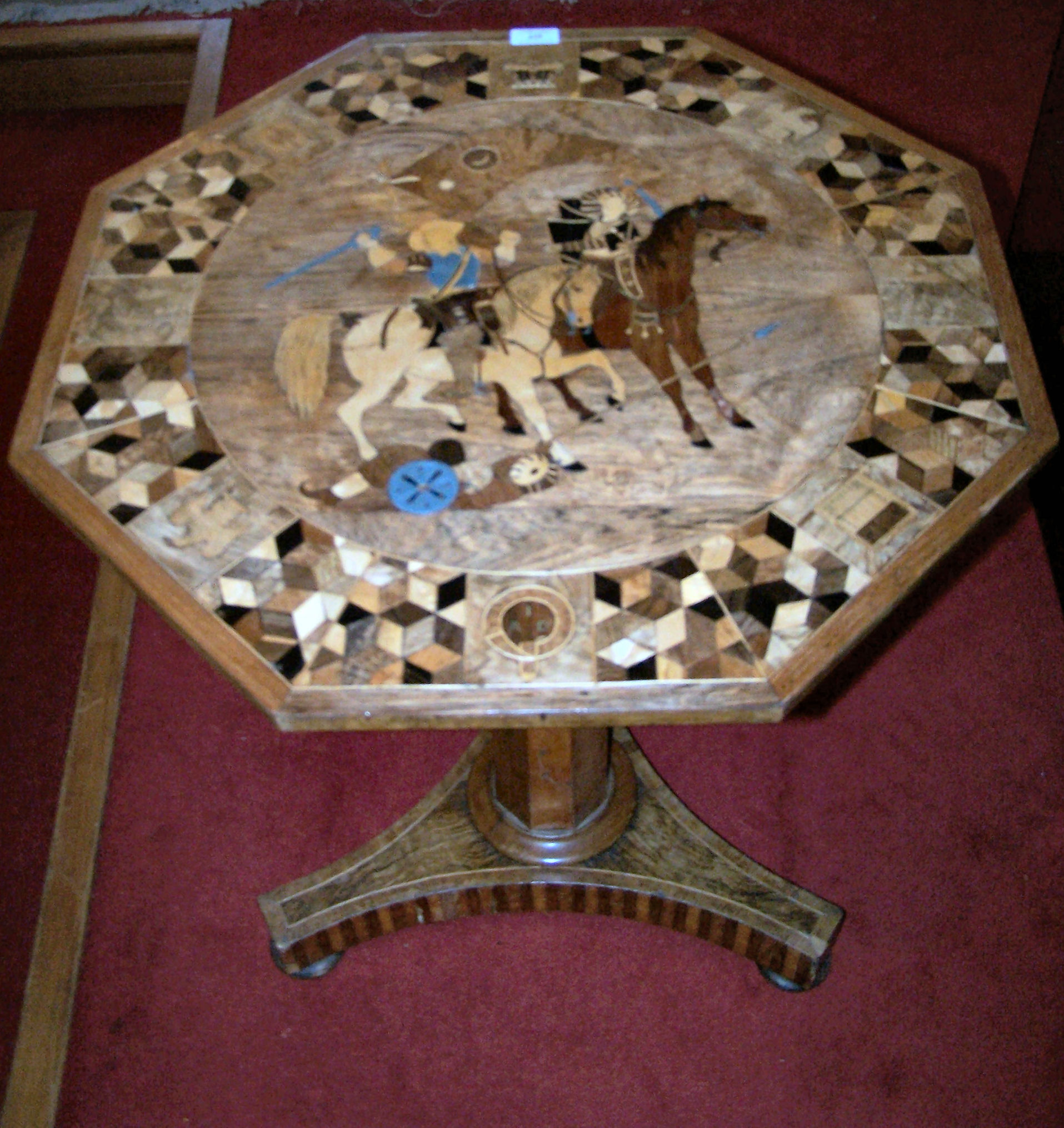 the octagonal snap top with a border of parquetry, and panels inlaid with a crown, eagles, flag, garter belt with IRD and two panels, 'At Algiers in Africa 1661', the large central marquetry panel depicting two fighting horsemen in 17th century costume, with pewter details, raised on an octagonal column and terminating in concave tripartite base, parquetry decoration