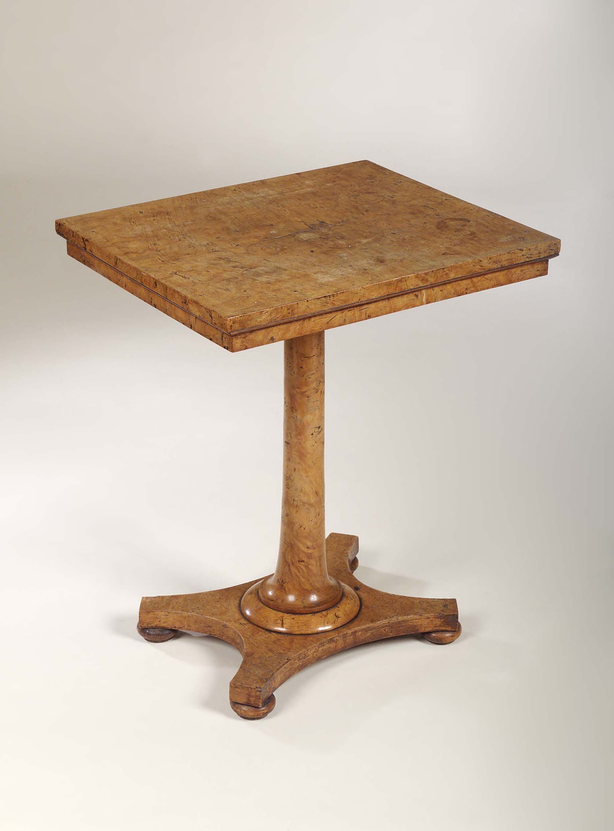 the rectangular top with well figured veneers, plain frieze, cylindrical column, concave quadriform base, disc feet