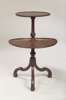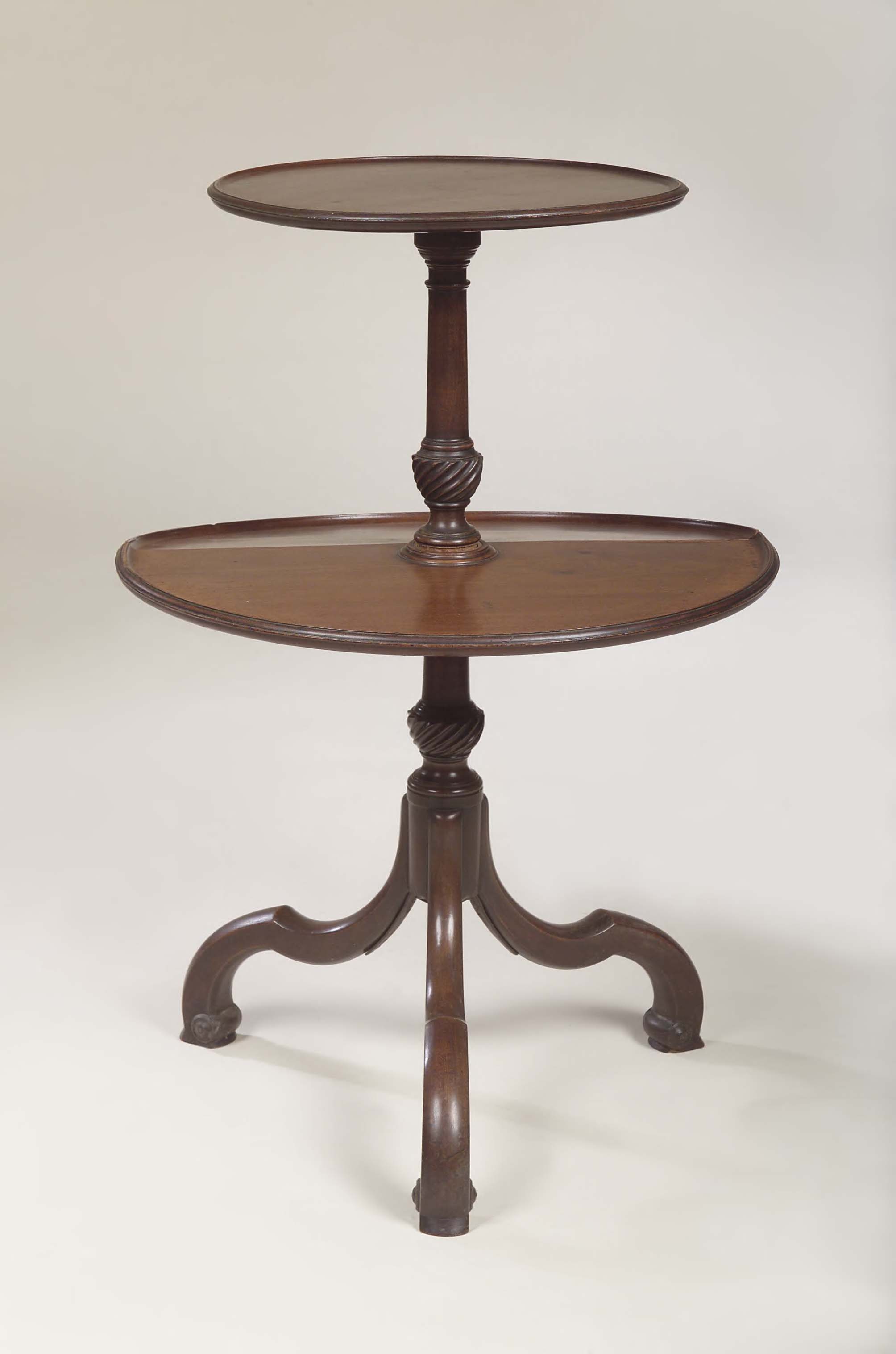 the plain circular top tier with raised lip, plain column support with wrythen baluster knop and similar support, scrolling tripod legs, block feet