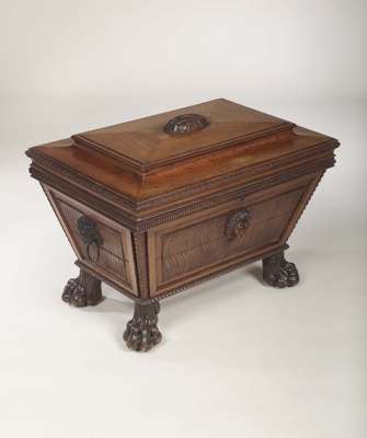 of sarcophagus form, the shaped lid with central carved leaf carved motif, and with carved border, above tapering sides with low relief carved wavy panels, a carved lion mask to the front panel and side bronze lion mask ring handles all on muscular paw feet, zinc lined interior, the interior of the lid with applied trade label for: 'George Simson, Upholder, of 19 South Side of St Paul's Church Yard, London'
