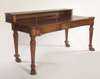 the upper open stage supported by brass baluster columns and the deep table top with central entablature drawer flanked by wide concave drawer to each side, all on tapering fluted circular section legs and muscular paw feet (alterations)