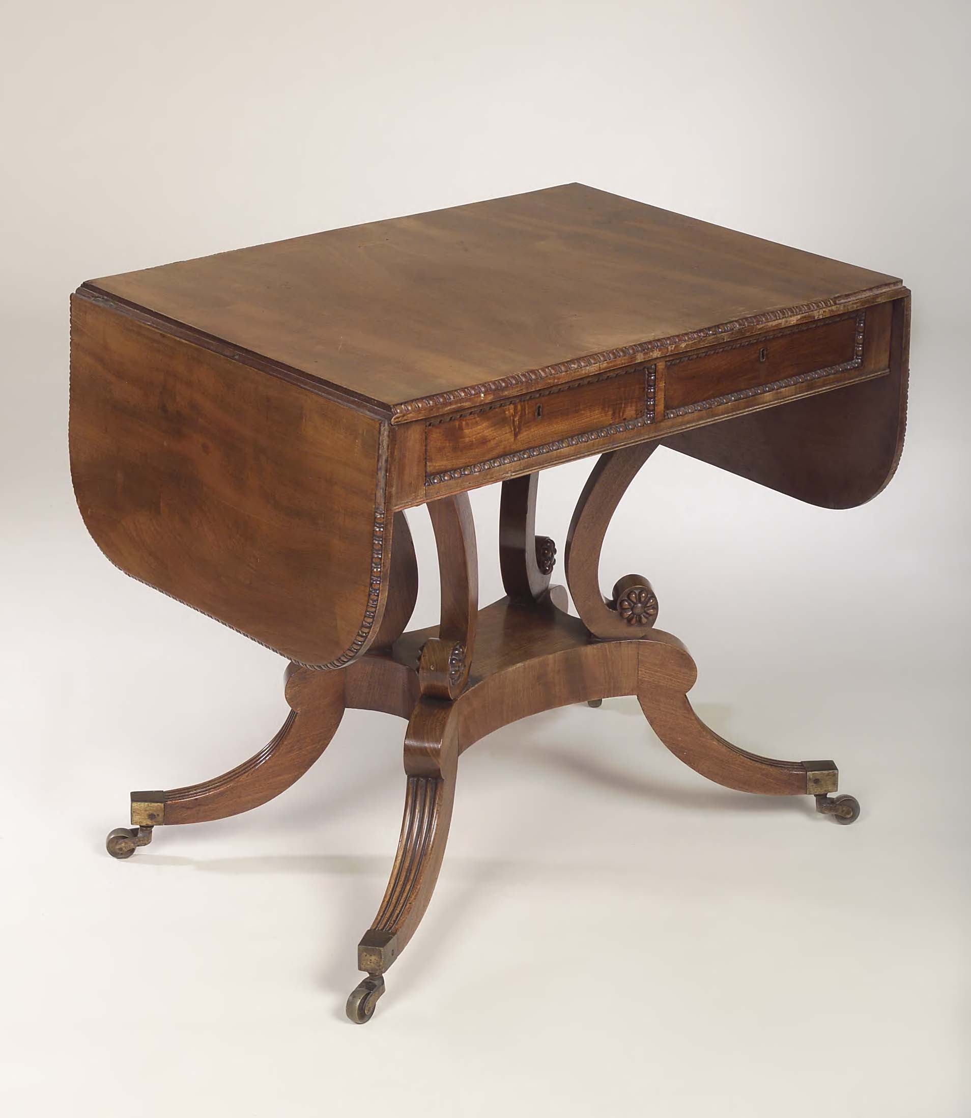 in the manner of William Trotter of Edinburgh, the rounded top with quarter beaded border, two frieze drawers with similar detail, all on scrolling supports with applied bosses, small quadriform base, and terminating in four reeded downswept legs, brass caps and castors