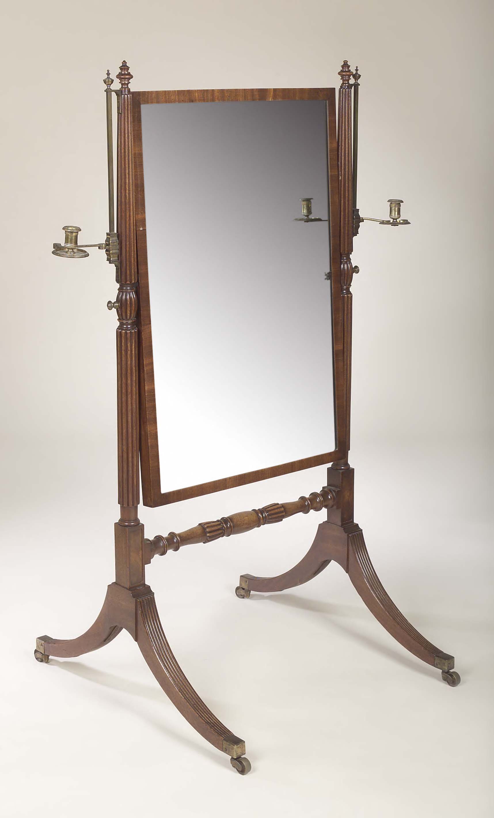 the reeded circular uprights with height adjustable and swivel candle holders, circular drip trays and onto downswept reeded legs, brass caps and castors