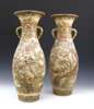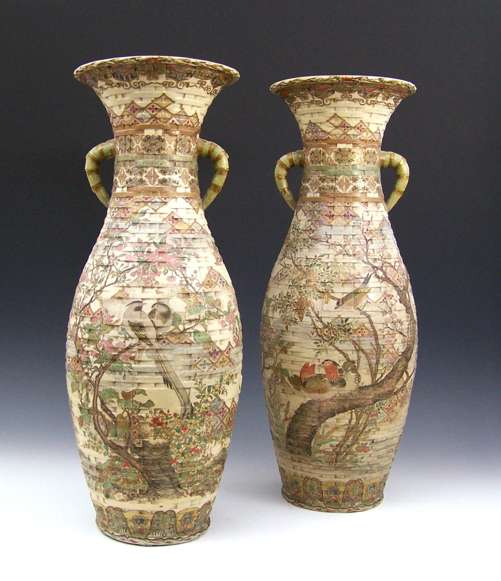 each of elongated baluster form, with basket-weave effect surface, the neck painted with stylised flowers, scrolls and geometric shapes, above the body decorated allover with birds in trees set in a landscape (2)