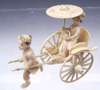 of a lady with a parasol in a two-wheeled rickshaw, being pulled by a male figure
