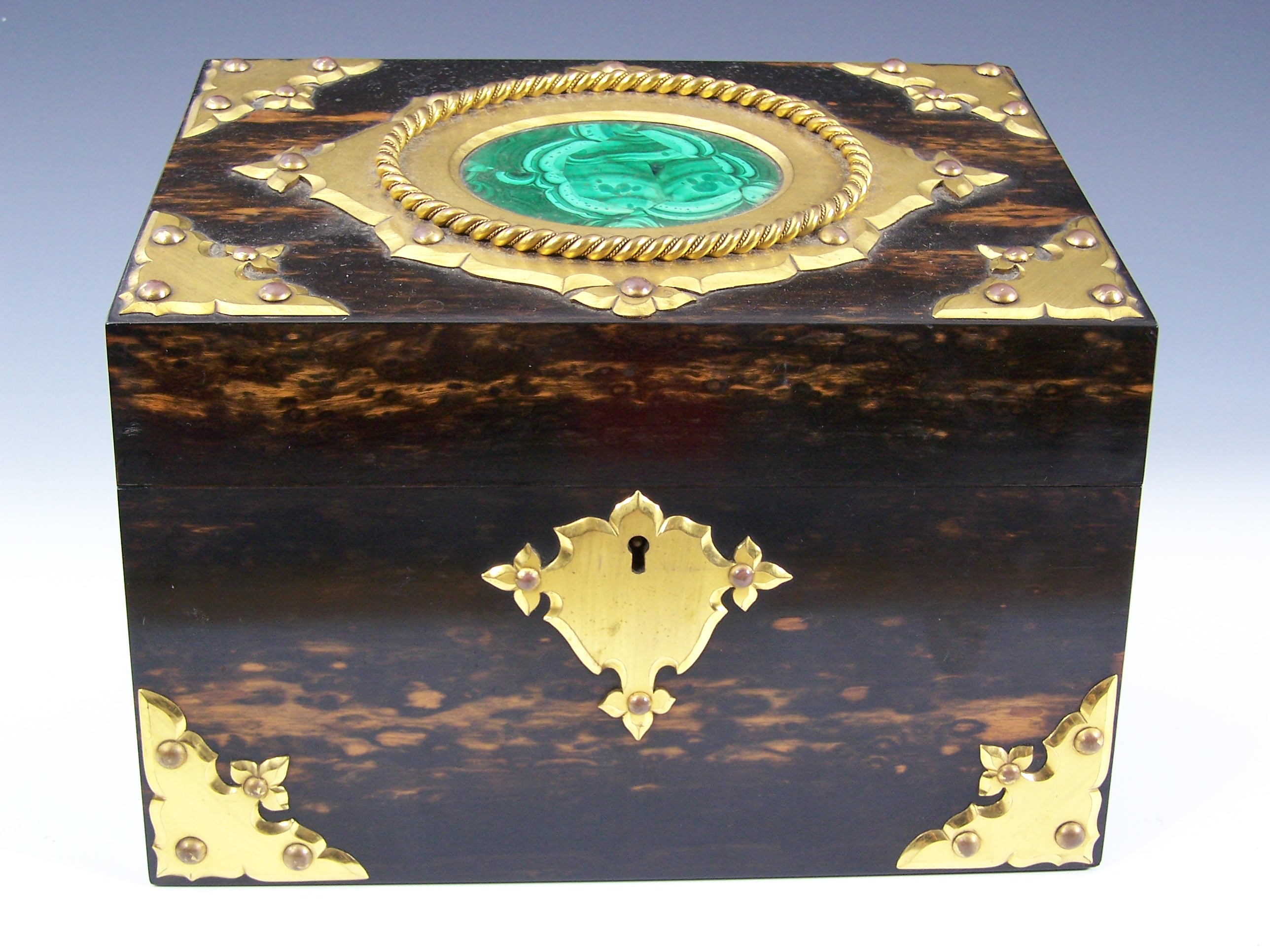 A Victorian coromandel, brass bound and malachite inset stationery box,