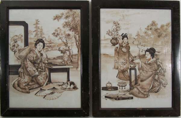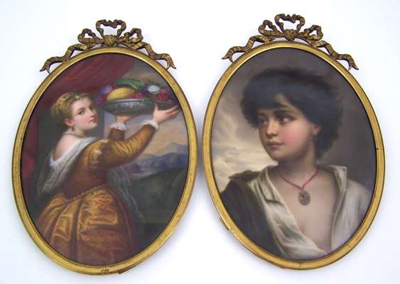 A pair of oval gilt framed painted porcelain panels,