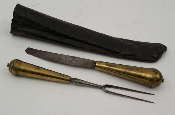 A rare early 18th century travelling steel bladed knife and two prong fork,